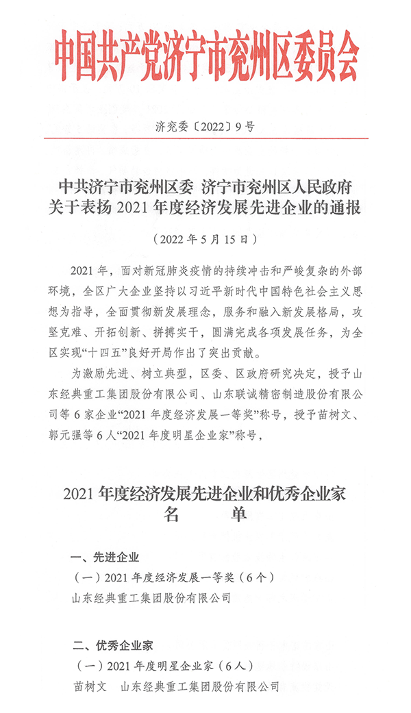 5月15日,兗州區(qū)委區(qū)政府發(fā)布《關于表揚2021年度經(jīng)濟發(fā)展先進企業(yè)的通報》,授予山東經(jīng)典重工集團股份有限公司“2021年度經(jīng)濟發(fā)展一等獎”稱號,授予經(jīng)典集團董事長苗樹文“2021年度明星企業(yè)家”稱號。