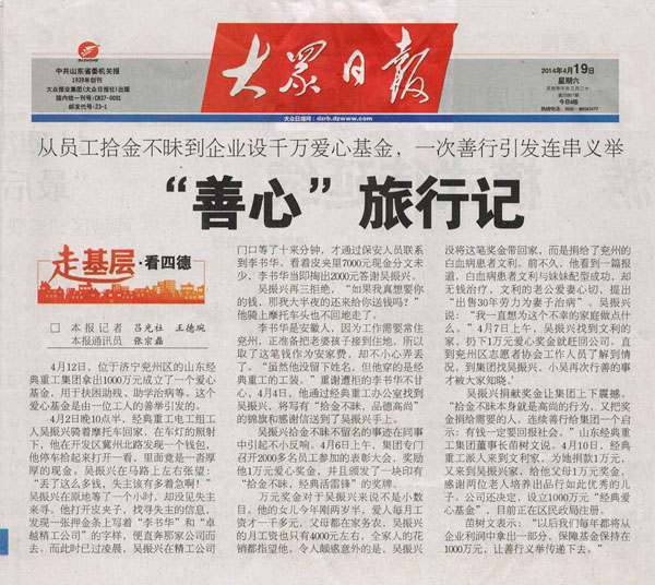 4月12日,位于濟寧兗州區的山東經典重工集團拿出1000萬成立了一個愛心基金,用于扶困助殘、助學治病等。這個愛心基金是由一位工人的善行義舉引發的。
