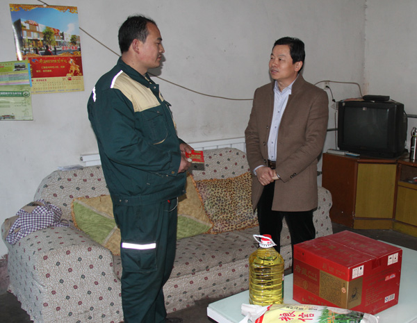 每到一戶,集團領導與職工家屬親切握手,面對面促膝交談,了解職工的家庭收入、子女入學、生活實際困難情況。送去大米、面粉、食用油等生活物資及600元公司慰問金,集團領導鼓勵職工振奮精神,充滿信心,相信集體,克服眼前困難。