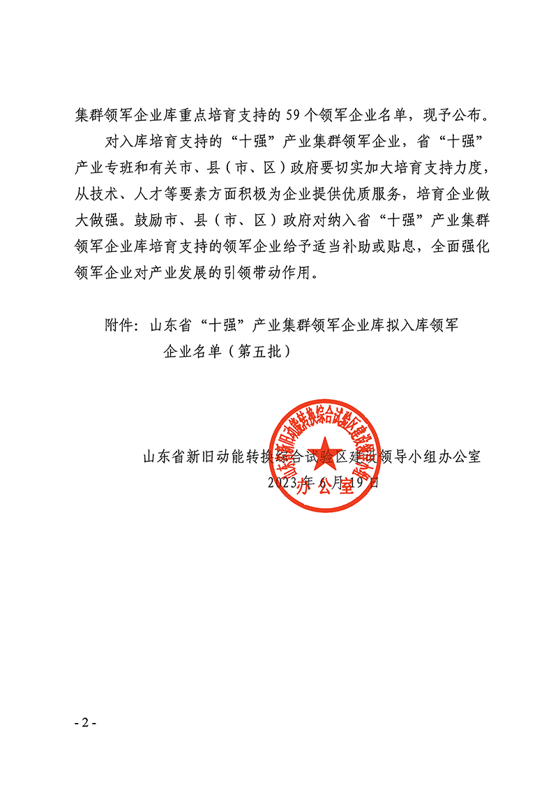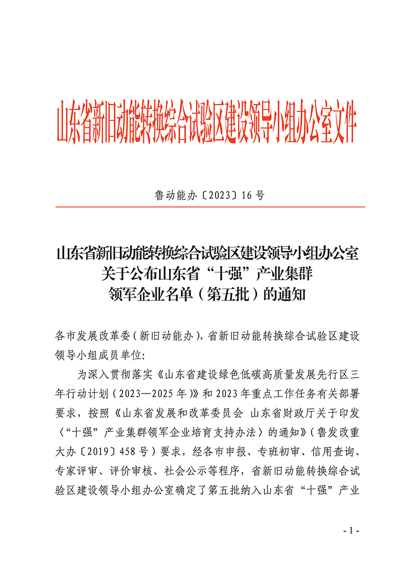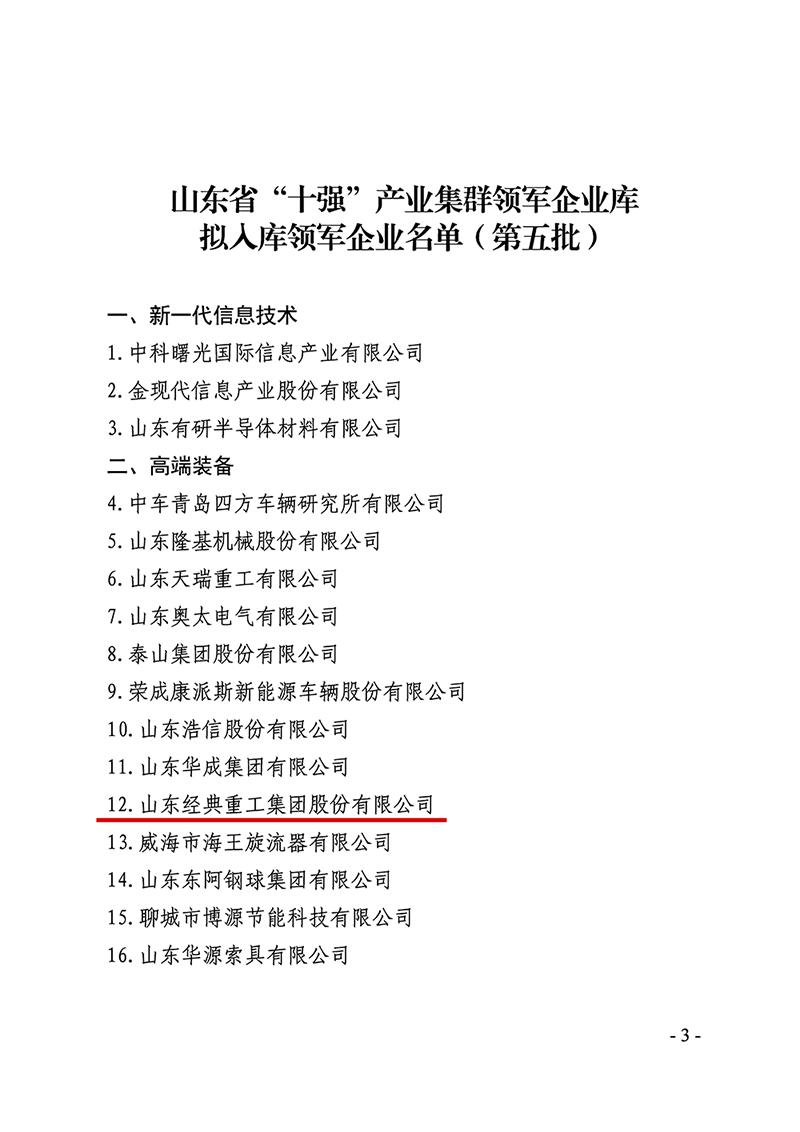 6月19日,山東省新舊動能轉(zhuǎn)換綜合試驗(yàn)區(qū)建設(shè)領(lǐng)導(dǎo)小組辦公室發(fā)布了《關(guān)于公布山東省“十強(qiáng)”產(chǎn)業(yè)集群領(lǐng)軍企業(yè)名單(第五批)的通知》(魯動能辦【2023】16號),山東經(jīng)典重工集團(tuán)股份有限公司成功入選山東省“十強(qiáng)“產(chǎn)業(yè)集群領(lǐng)軍企業(yè)名單。